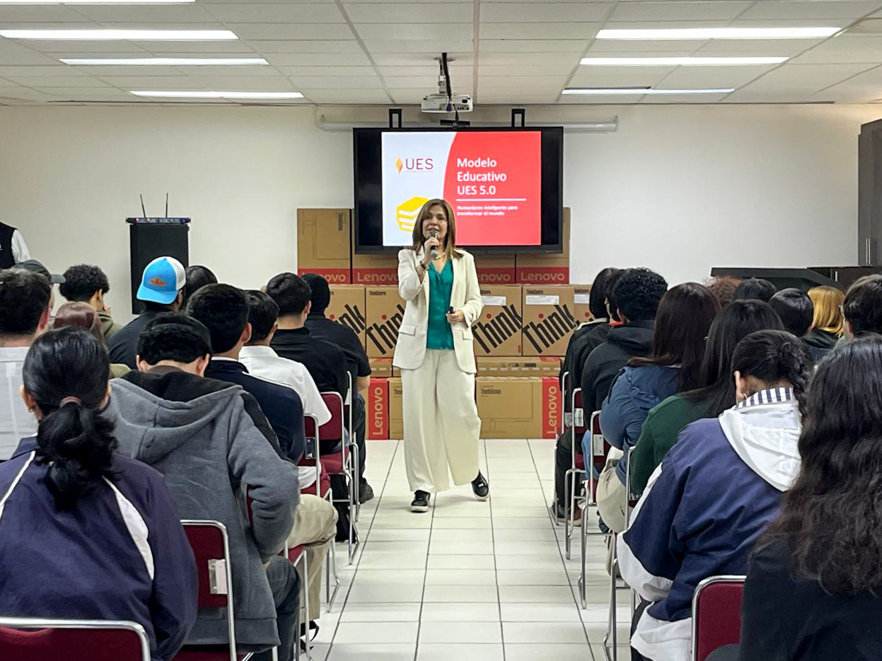 Durante la gira de trabajo, la rectora de la UES, Martha Patricia Patiño Fierro, presentó el Modelo Educativo UES 5.0: Humanismo Inteligente para transformar el mundo ante docentes de todos los programas educativos, destacando su próxima implementación y su enfoque humanista, innovador y de vinculación social para la formación integral del estudiantado.