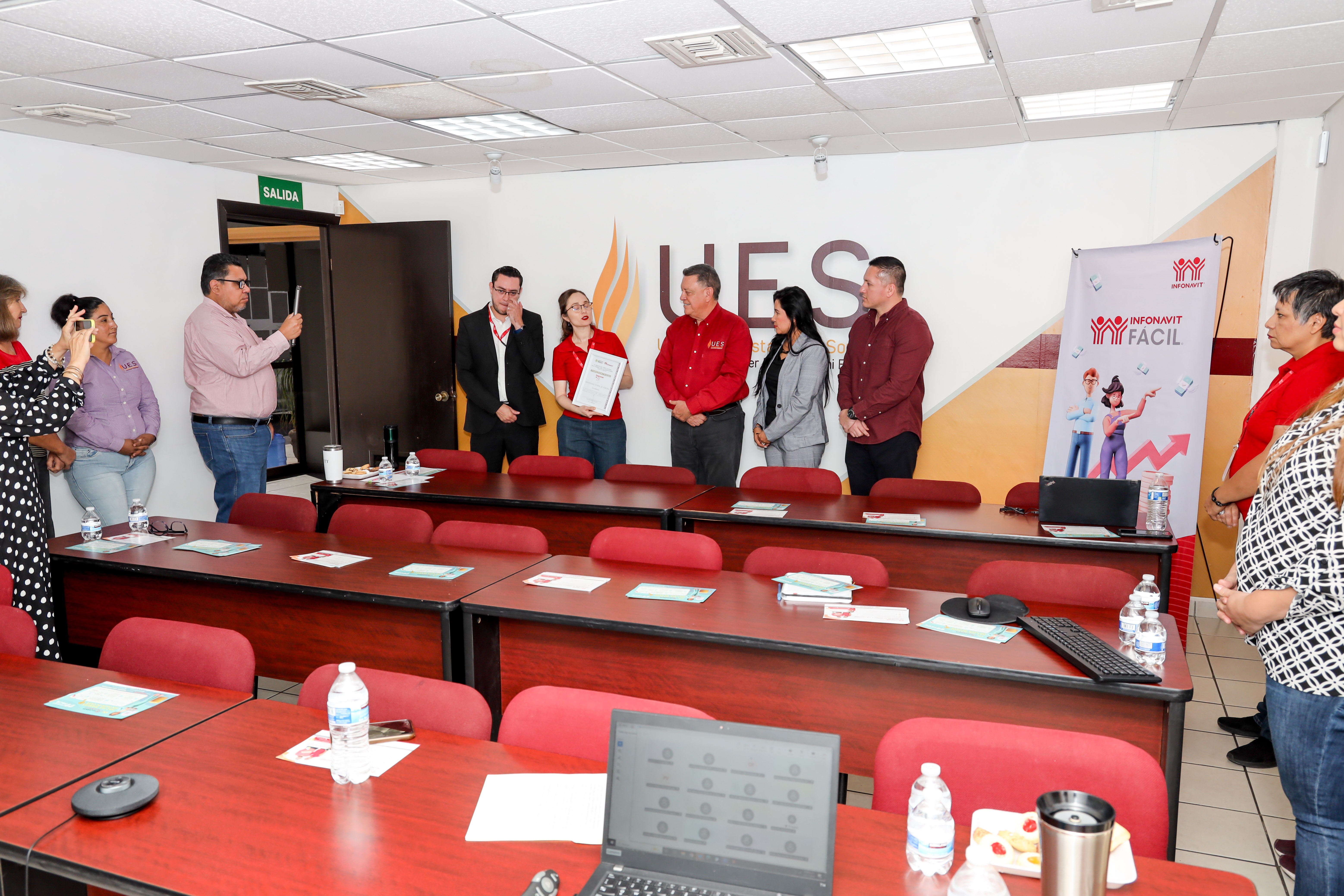 El reconocimiento fue entregado por Noelia Guadalupe Gautrin Córdova y Carlos Domingo León Orozco, en representación del Infonavit, al secretario general administrativo de la UES, José Antonio Romero Montaño, y fue acompañado por personal de Recursos Humanos y por el secretario general de Planeación, Jorge Omar Herrera Gutiérrez.